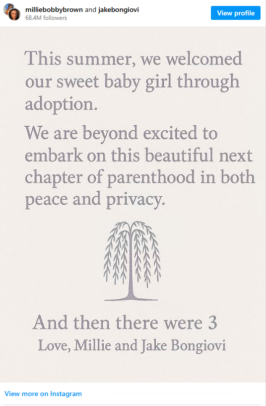 Despite being just 21 and newly married to Jake Bongiovi, Brown reportedly decided to adopt an infant. She kept the name private and always covers the baby’s face in public, writing on IG, “We are beyond excited to embark on this beautiful next chapter of parenthood in both peace and privacy.” Many criticized the couple for being too young to be parents.