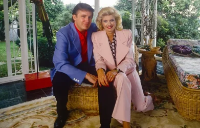 Posed on wicker furniture in a pink pantsuit while Donald sports what looks like a magician’s blazer in blue, Ivana appears at ease, radiant, and surprisingly relatable. Who knew the woman later known for cutting jabs at Marla Maples once embraced domestic coziness?
